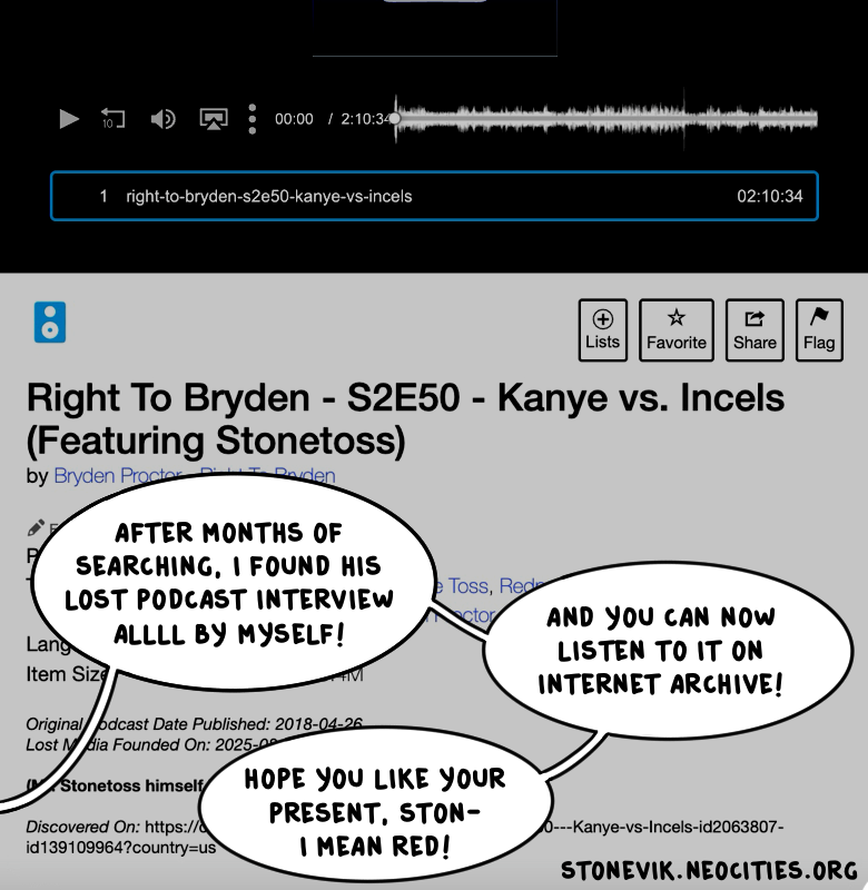 On August 8th, 2025, I was finally able to find the podcast episode "Right To Bryden - S02E50 - Kanye vs Incels", an episode that featured Stonetoss, published on April 26th, 2018. So after 7 YEARS, I'm happy to say that Stone won't be able to scrub this episode off the internet anytime soon.